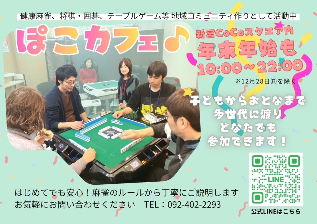 特定非営利活動法人ぽこの会は、新宮cocoスクエアにおいて、麻雀・囲碁・将棋・ボードゲーム等の知的ゲームを活用した多世代交流事業を展開しています。