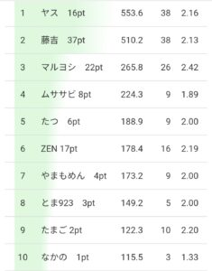 平均着順2.23位トップ率30%連対率62.7%ラス率16.2%スコア448.9