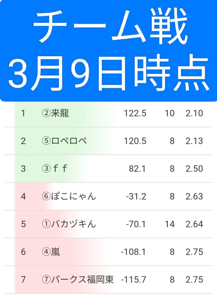 次は12日(水)配信でお会いしましょう!対戦チームは③ff④嵐⑤ロペロペ⑥ぽこにゃんです。