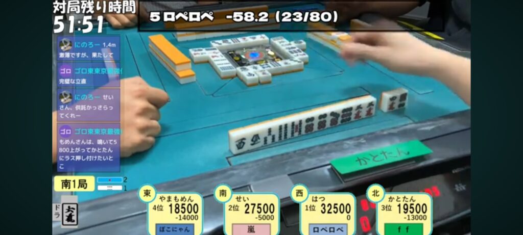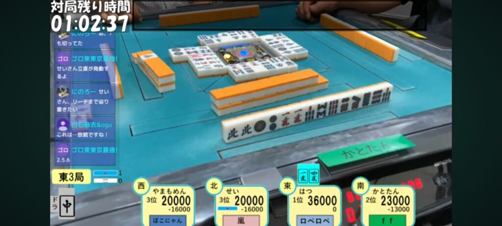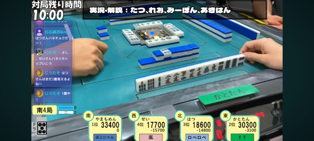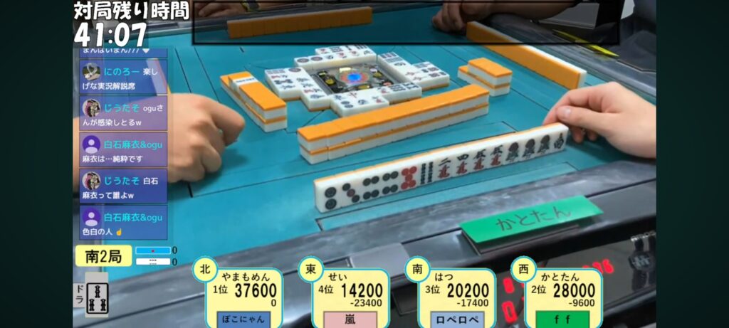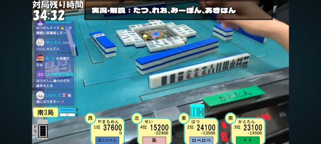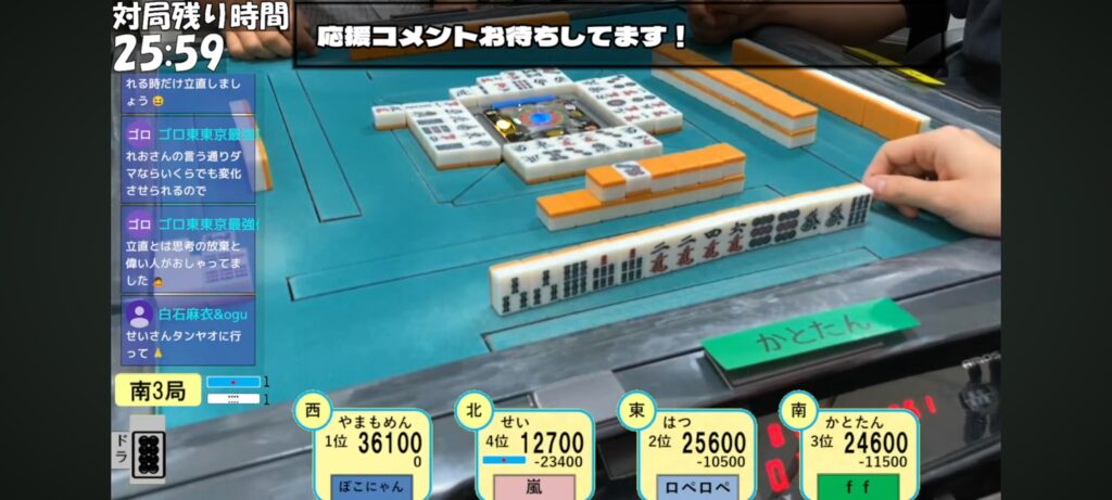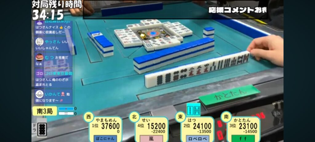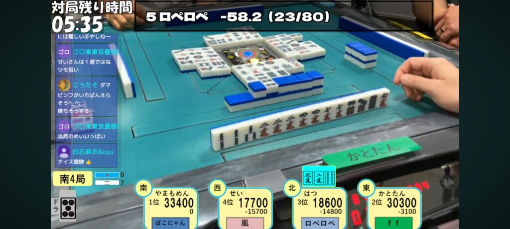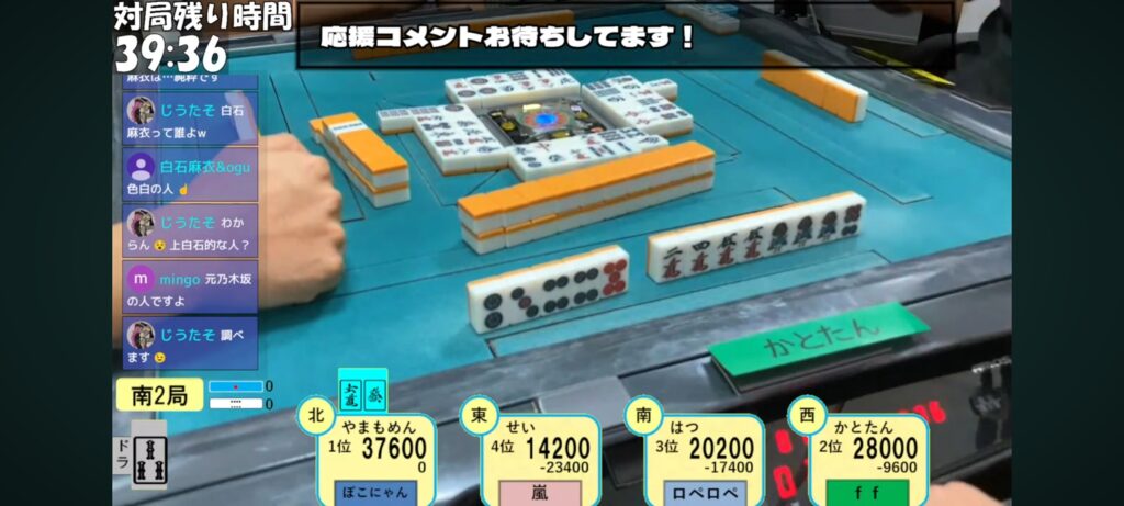 上家のはつさんがタンヤオ仕掛けで白対子落としで受けつつイーシャンテン。