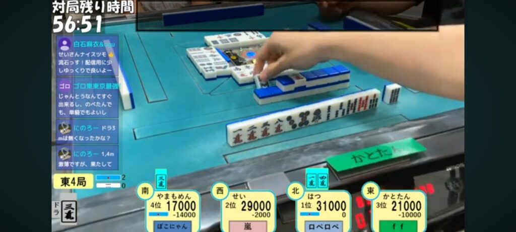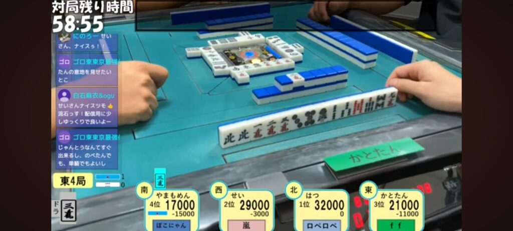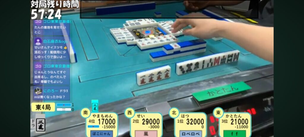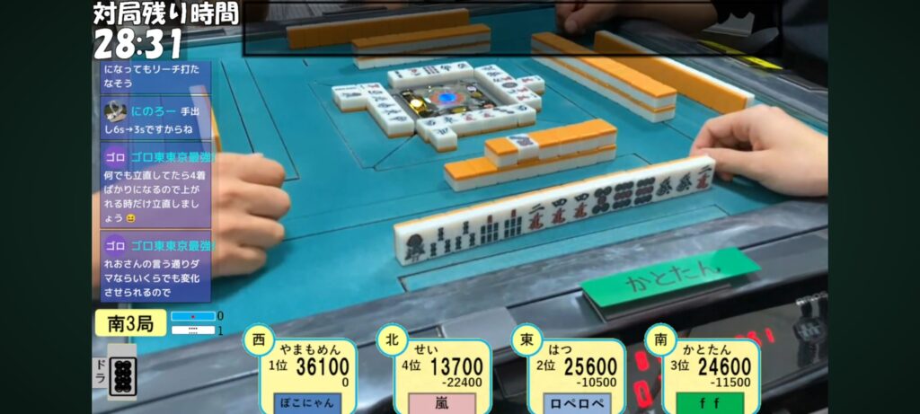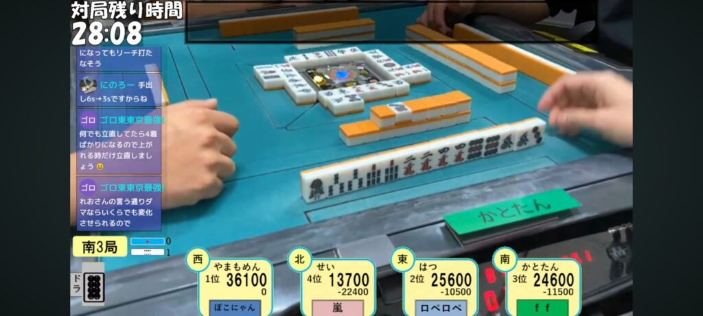 しかし進まず、2軒リーチ。形テン狙いのチーで打④ピン。結果は最悪の8000オール。まあ喰い流れとかはネタにはするけど気にはしてないです。
