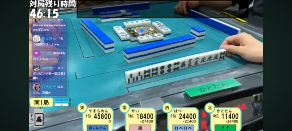 現物1ソウ待ちで粘ってましたが、6ソウ打つと目立つのもあって打1ソウ。その後六万で迂回。