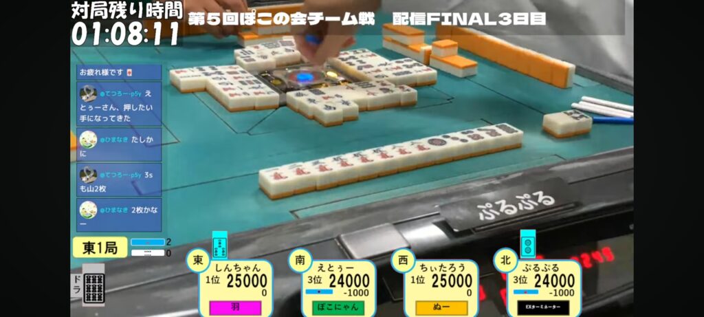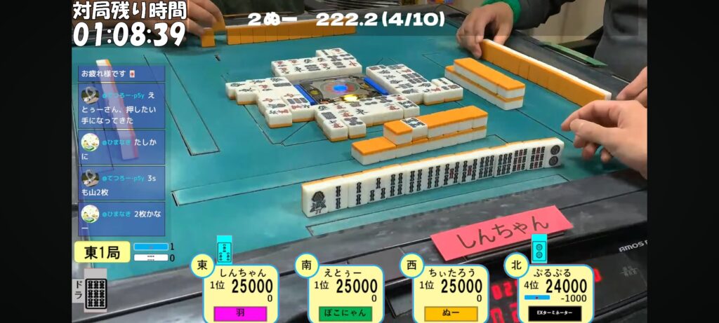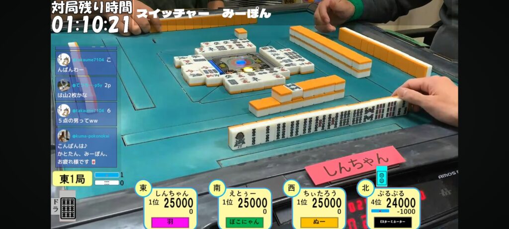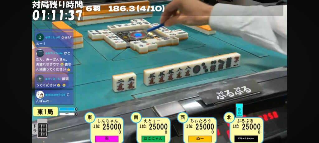 ぷるぷる選手がリーチのみカン2pで先制リーチ!これ自体は可もなく不可もなくでしたが…。
