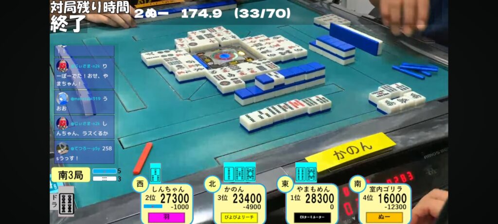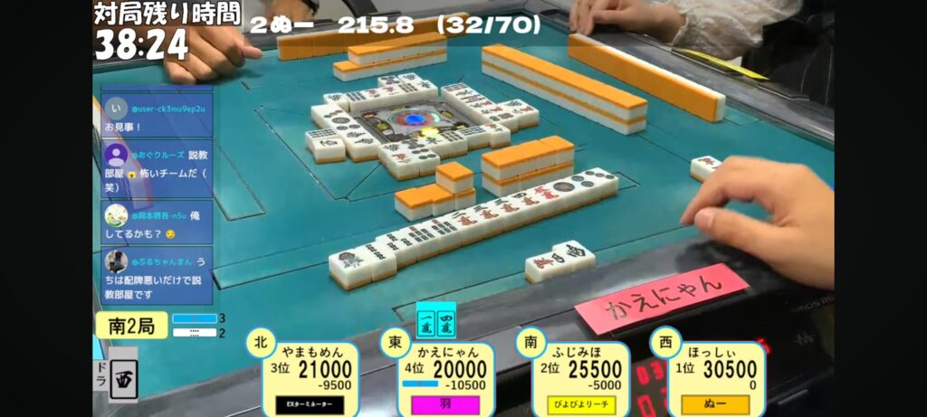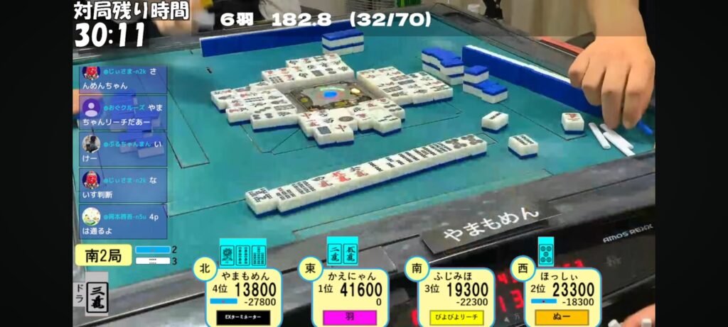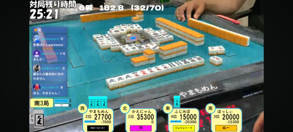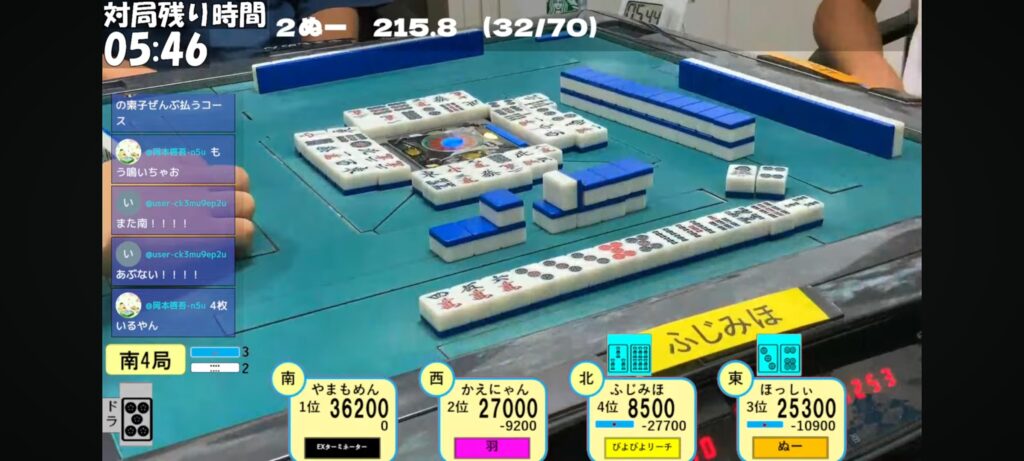 最後のふじみほ選手は一発でツモる事により4着→2着と劇的な展開となりました!トップは2連即ツモのやまもめん選手でした!