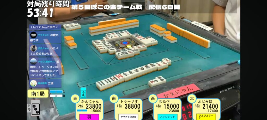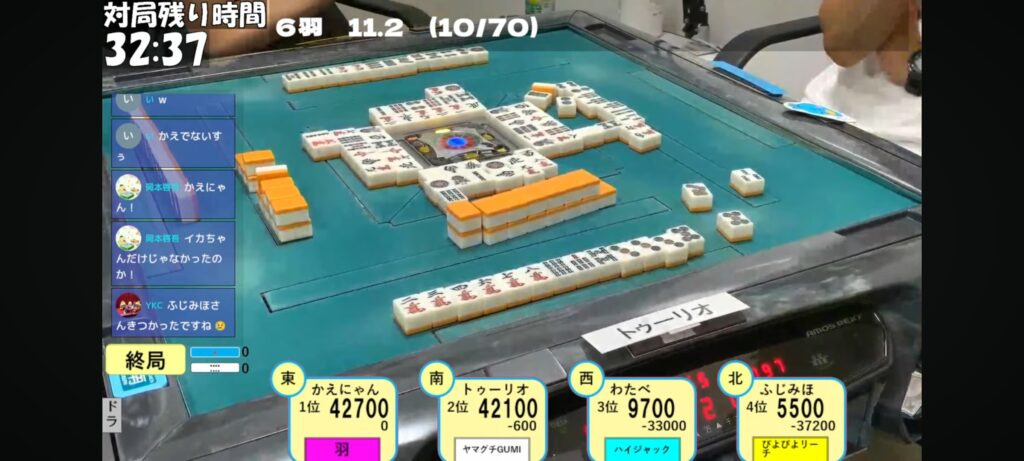 ヤマグチGUMIのまおー選手は更にめちゃくちゃついて無かったですね。東発のドラドラ1-4m待ちリーチが12000放銃になり、ダマテン6400地獄待ちに当たったりとこれは可哀想となる様な展開でしたね。切り替えて次戦頑張って頂きたいです!