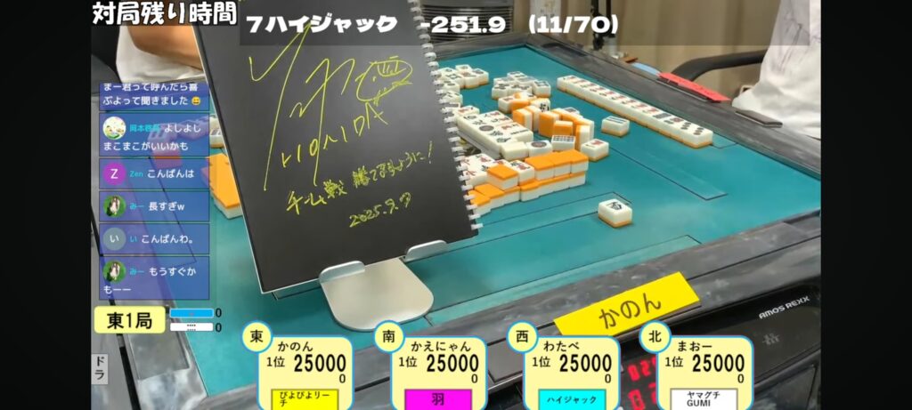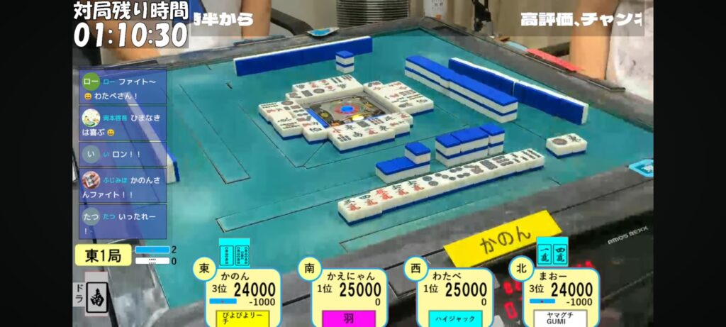 第一試合は一撃必殺リーチ一発七対子ドラ3の18000で抜け出したかえにゃん選手が逃げ切りトップ獲得でした!