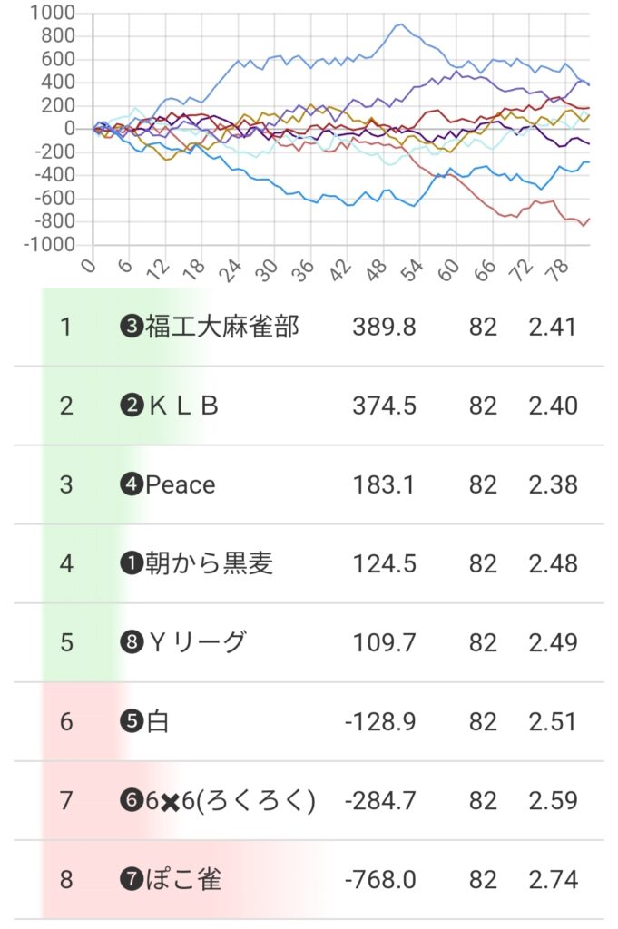 出場チーム3つ目は朝から黒麦。現在4位スコア124.5。波の激しいチームで最初は-300 までいき、一時期は2位まであがり現在4位。最後は好調のおかん2連戦予定です。