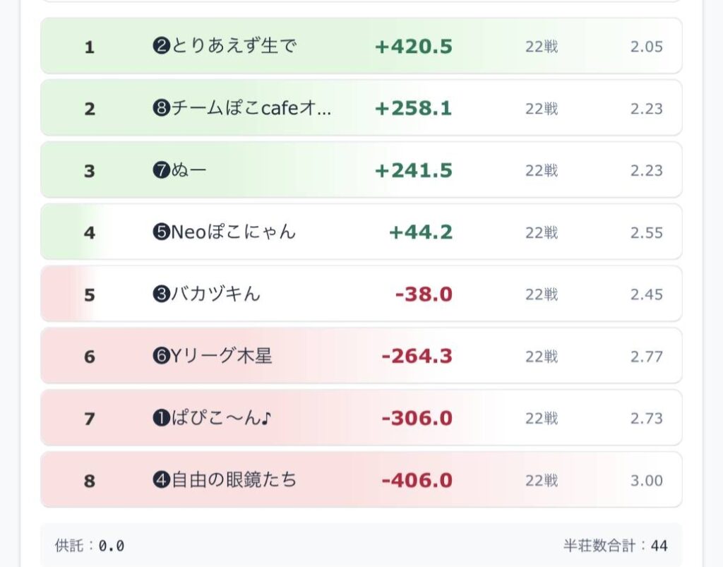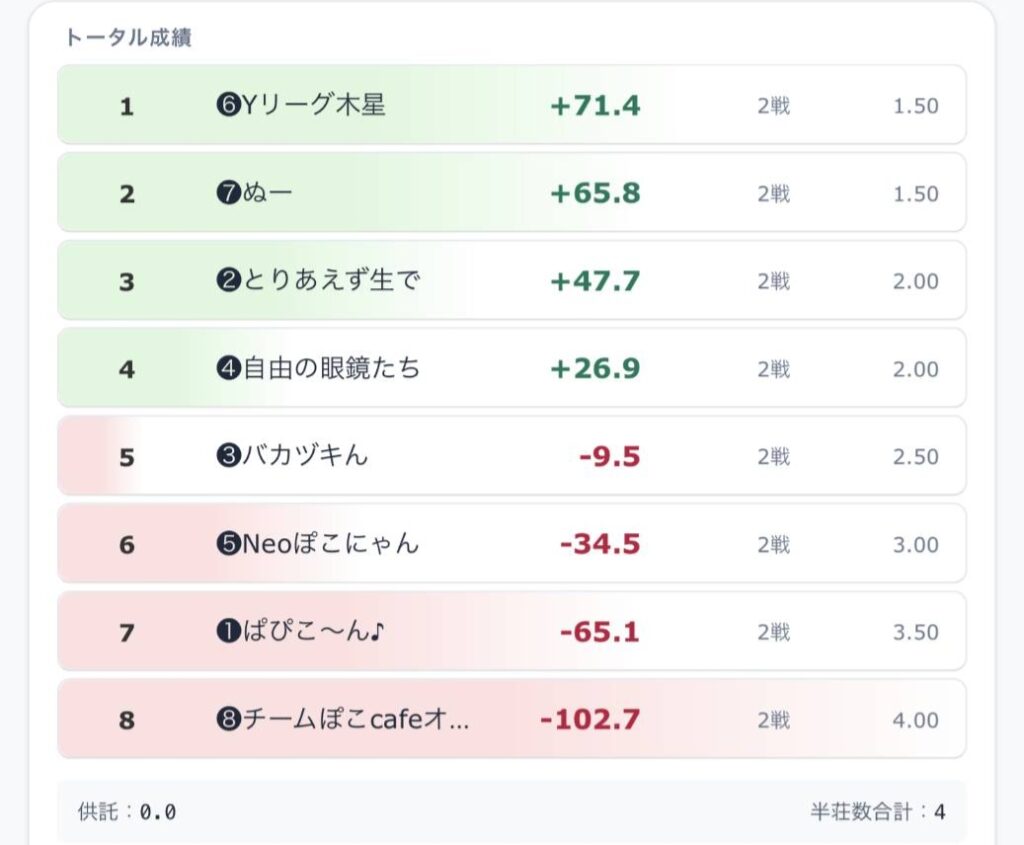 かとたん配信の夜の部は、ぬーのたつ選手トップ!でしたが、オーラスのYリーグ木星チームみーぽん選手の倍ツモが凄すぎました🤩