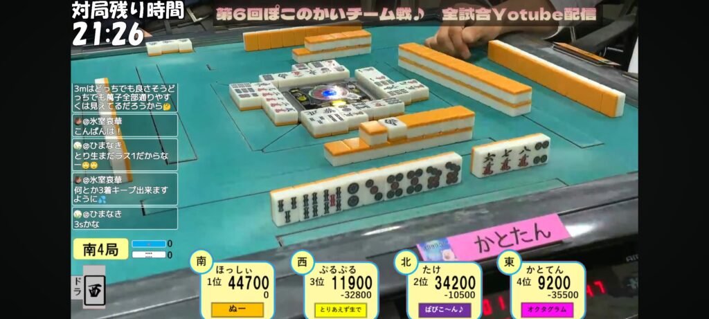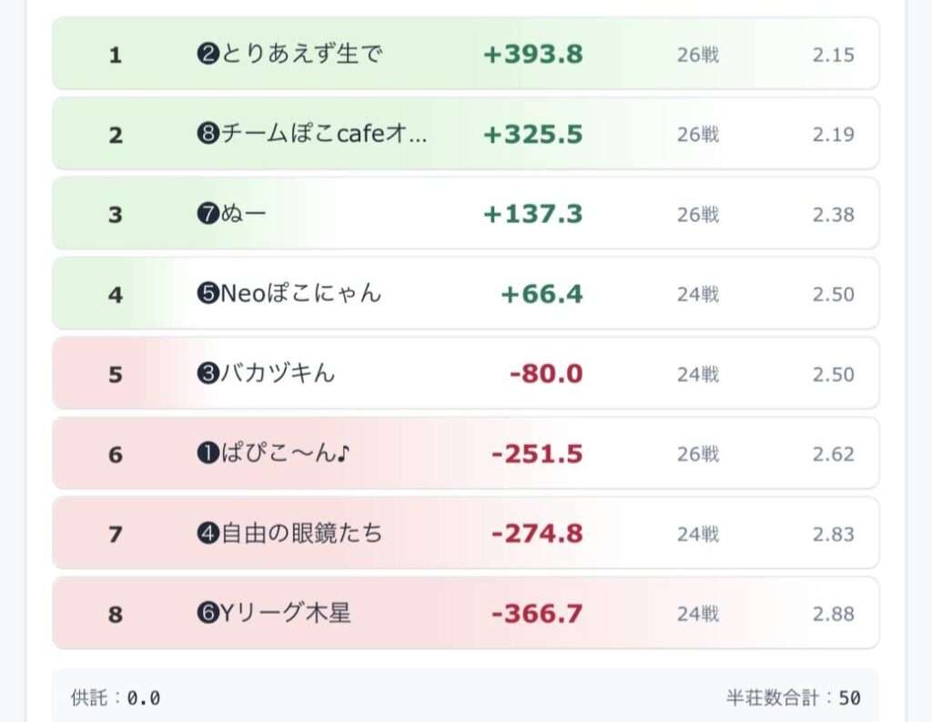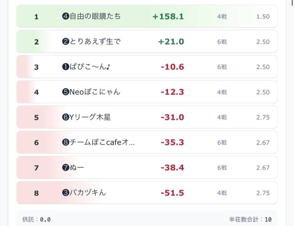 しれっと実は呪われている⁉️チームがあります。ぱぴこ〜ん♪チームが2回目の他チームのアガリ見逃しによってトップが変わる事になりました…。悲しい🥲