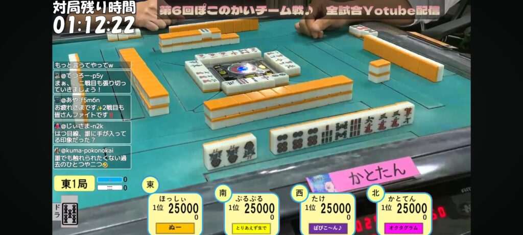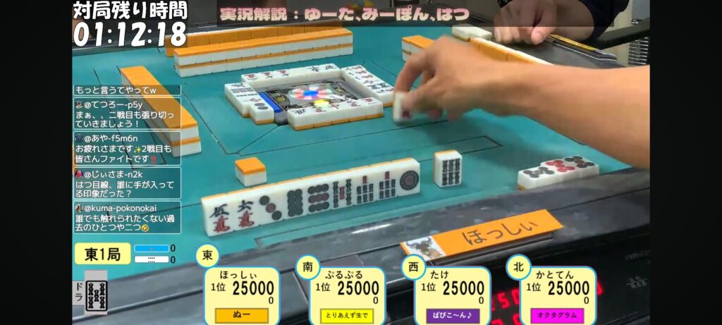 第1戦目は好調とりあえず生でチームぷるぷる選手がトップ獲得‼️2戦目はかとたん参戦でしたが3着、ぬーチームのほっしぃ選手が初戦ラスを取り戻すトップでした‼️