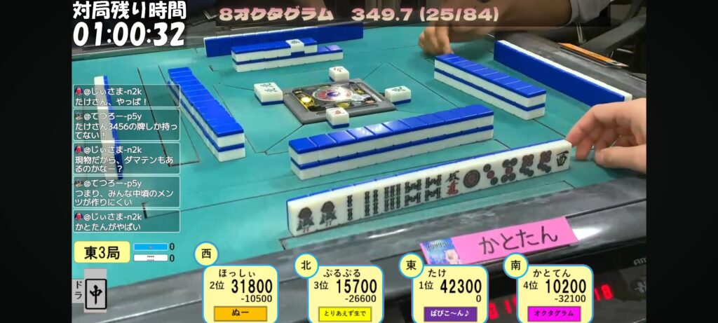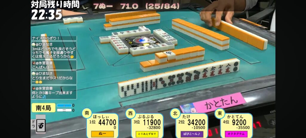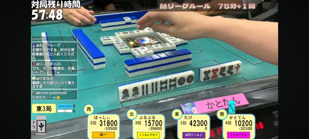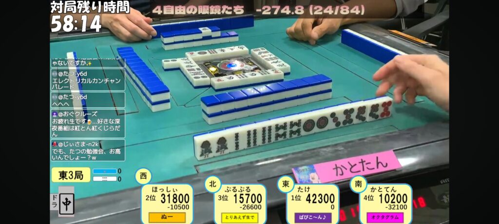 リーチ一発目に3sを押すぷるぷる選手。3s手出しなのがいやらしいですね。トイツ落としですからね。
