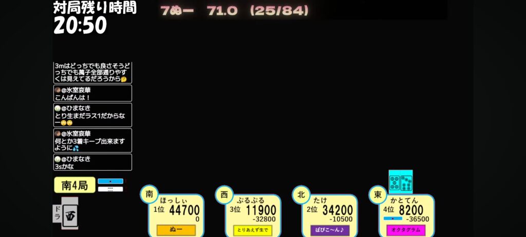 結果は2人テンパイで連チャン‼️次局対面の条件が少しキツくなるのでテンパイ宣言はしました。僅差であれば伏せ寄りでしたね。