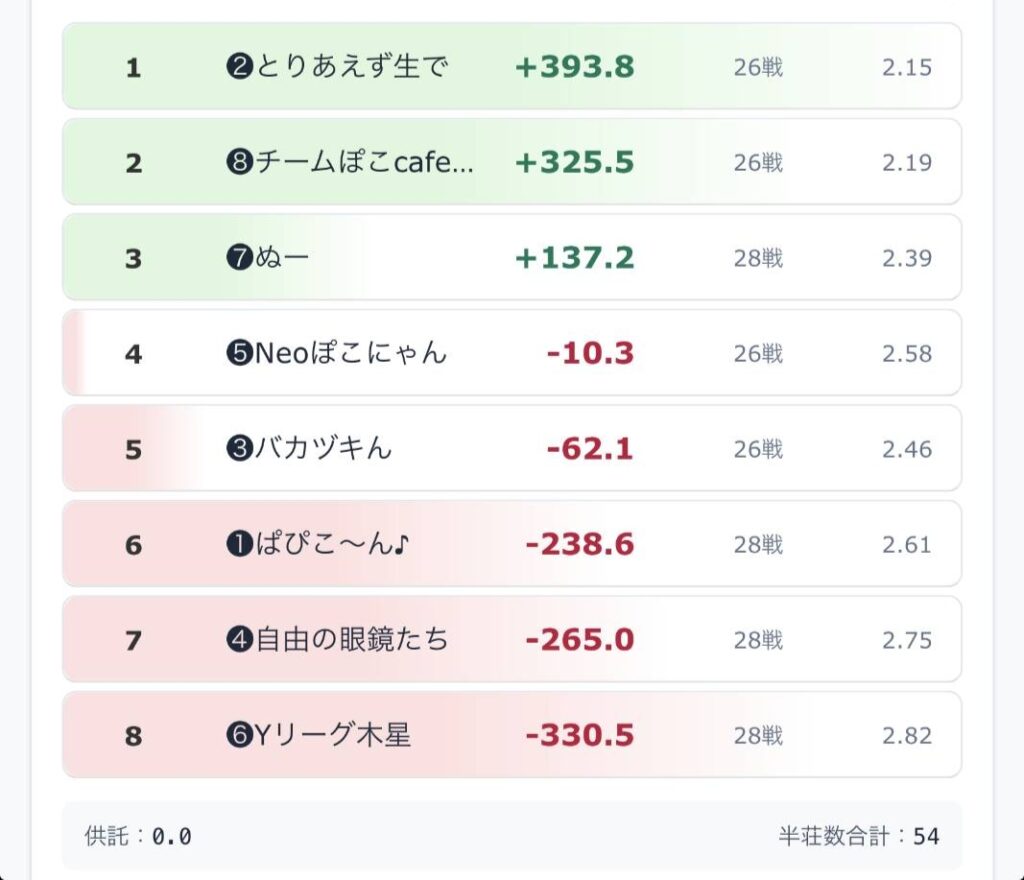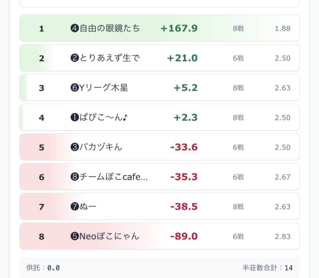 夜の配信は1戦目好調自由眼鏡まろん選手トップ、2戦目は初戦ラスのさとし選手が初戦ラスを取り戻すトップでした‼️