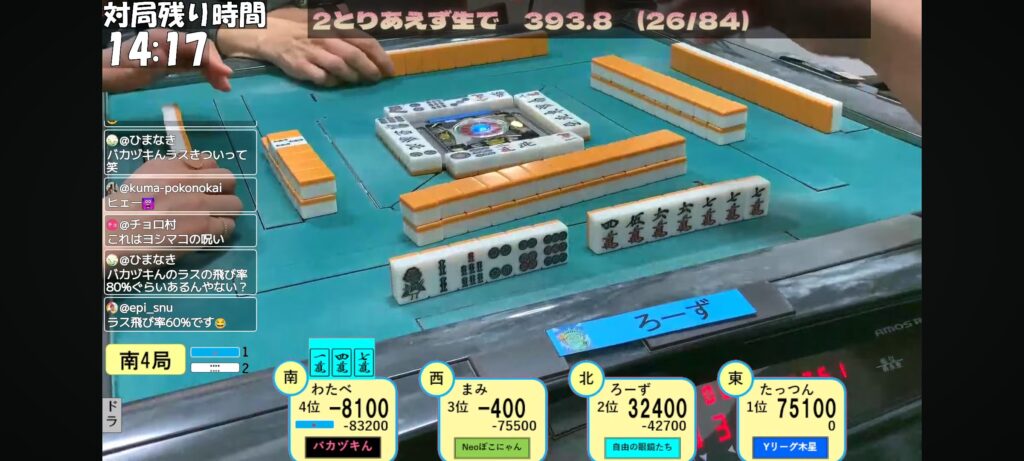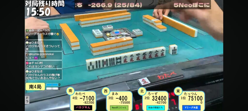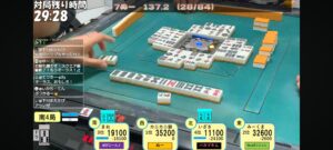 初戦トップのわたべ選手でしたが、オーラスまさかの24000放銃でラスへ転落…。次局3着を目指して先制リーチかけましたが…。