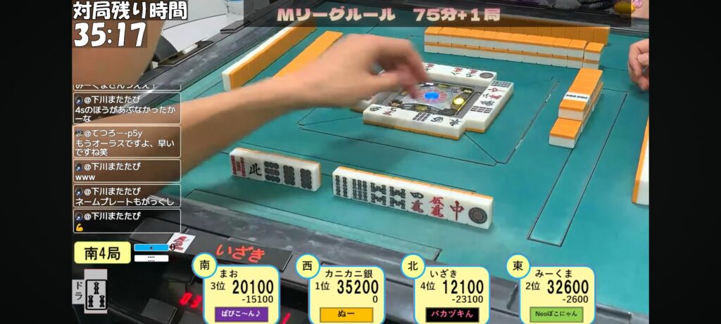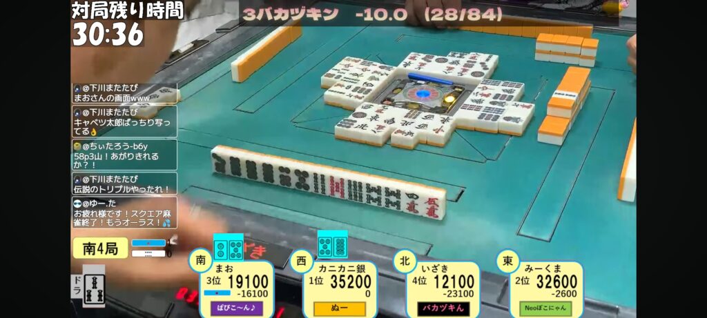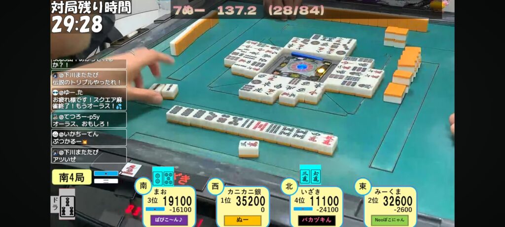 朝の配信は1戦目オクタグラムじぃさま選手がなんとまたもやトップ‼️2戦目はバカズキんけーご選手がお見事純全帯么九でトップを獲得‼️Neoぽこにゃんふじみほ選手は2着、2着の安定した着取りでした⚡