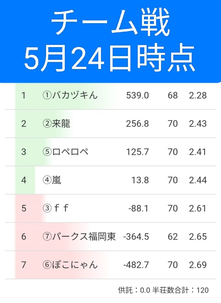さあ終盤戦らしくなってきました第四回福岡麻雀サークルぽこの会チーム戦ぽこチー。