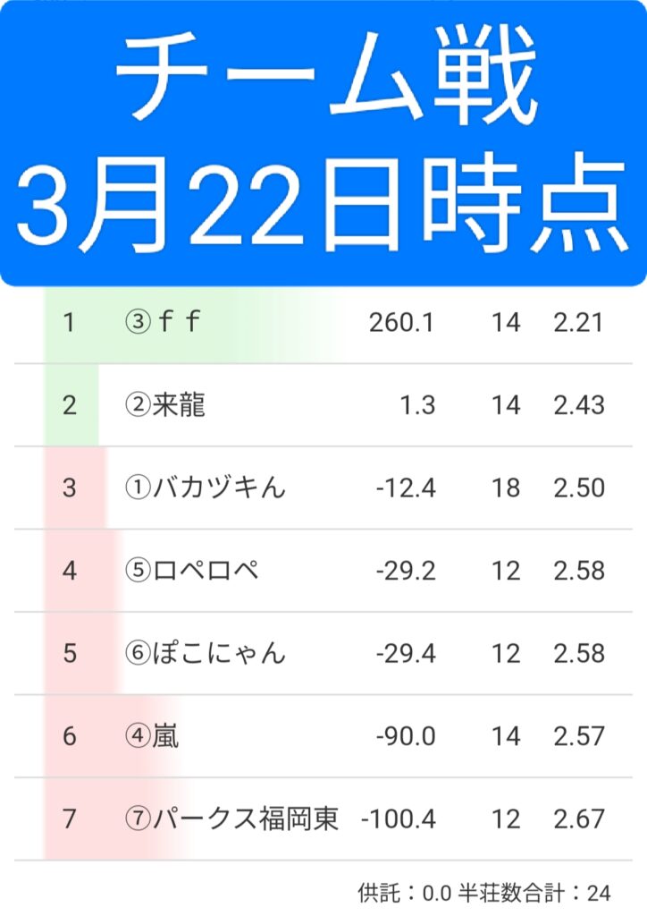 丸くなりましたね2位から7位までわずか100しかなくなりました。そして我がチームffが一人勝ちの状態🎉まあ今日の花一対局で大きく動くと思いますのでどうなるかですね。